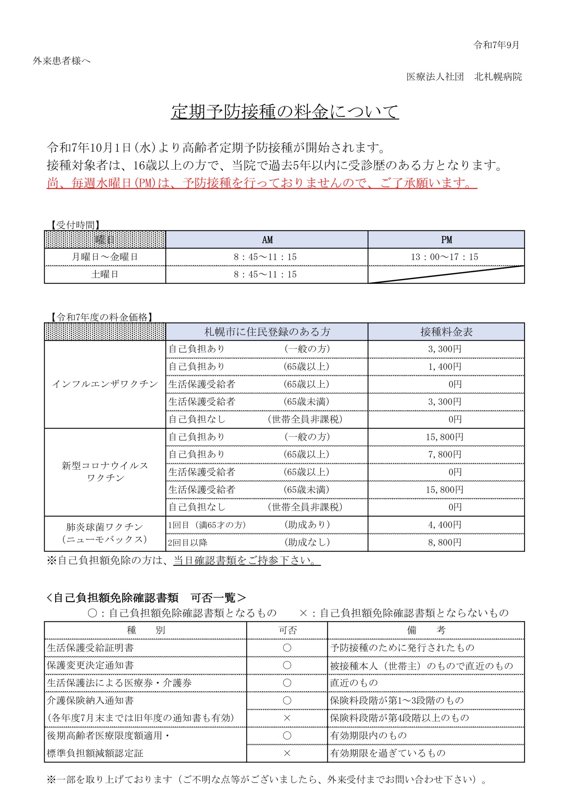 予防接種の料金、受付時間等につきましては、資料をご確認下さい。